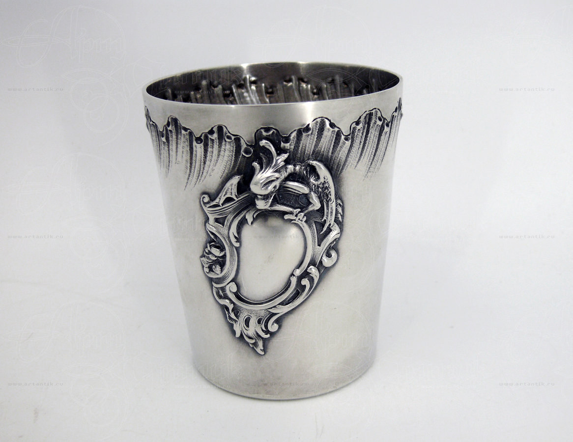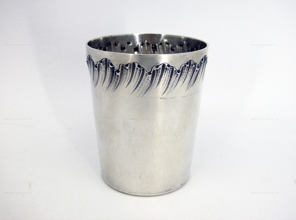 Серебряная стопа выполнена на московской фабрике прославленной фирмы К.Фаберже – Поставщика Высочайшего Двора, о чем свидетельствует гербовый орел, проставленный над клеймом фирмы.