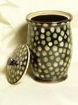 В разделах Стакан с крышкой, №15603Небольшой стакан с интересным "пятнистым" декором по чёрному фону, приятной формы. Наличие крышки делает возможным использовать сей предмет в качестве шкатулки.