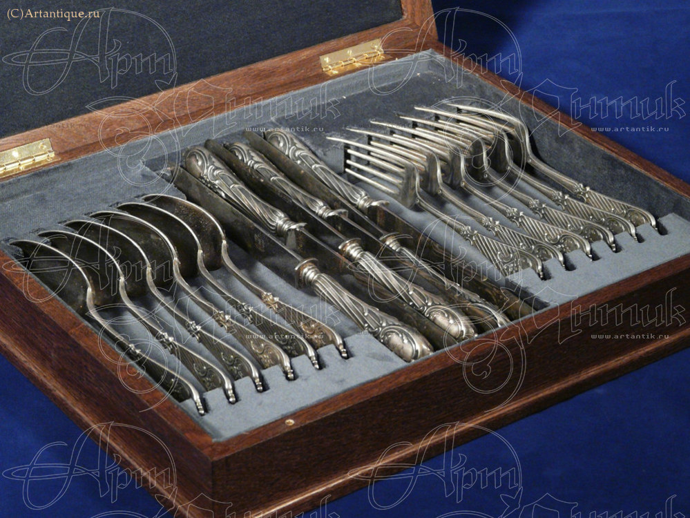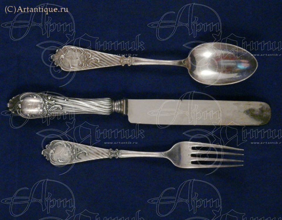 В набор входит 18 предметов: 6 вилок, 6 ложек, 6 ножей с клеймом на лезвии "Варыпаев" с гербом. Указана длина большого ножа.