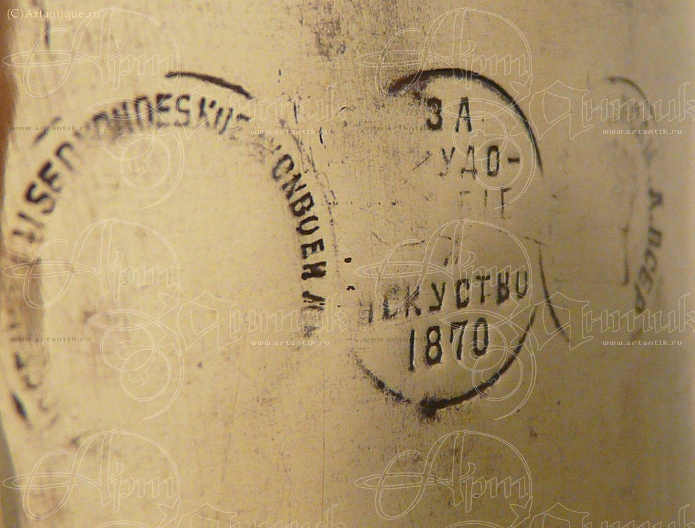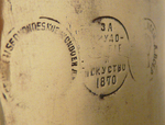 Тулово самоварной банки с перехватом в верхней части. Кран литой простой формы с трефовой веткой, репеёк ребристый. Две боковые фигурные ручки, самостоятельного крепления к тулову каждая, держат два деревянных хватка на шпильках, стянутых снаружи четырьмя малиновками.