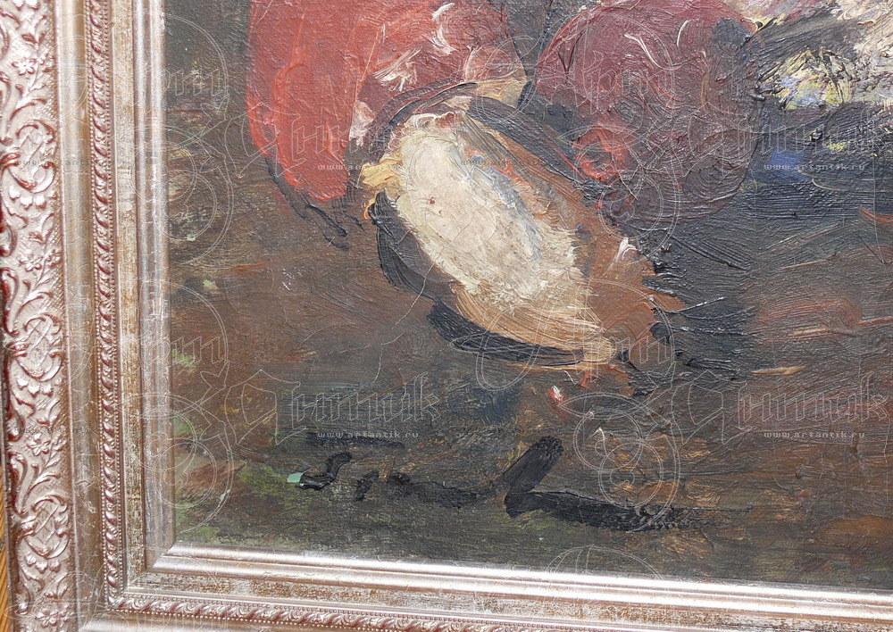 Есть 2 небольших пробоя холста и утраты красочного слоя.