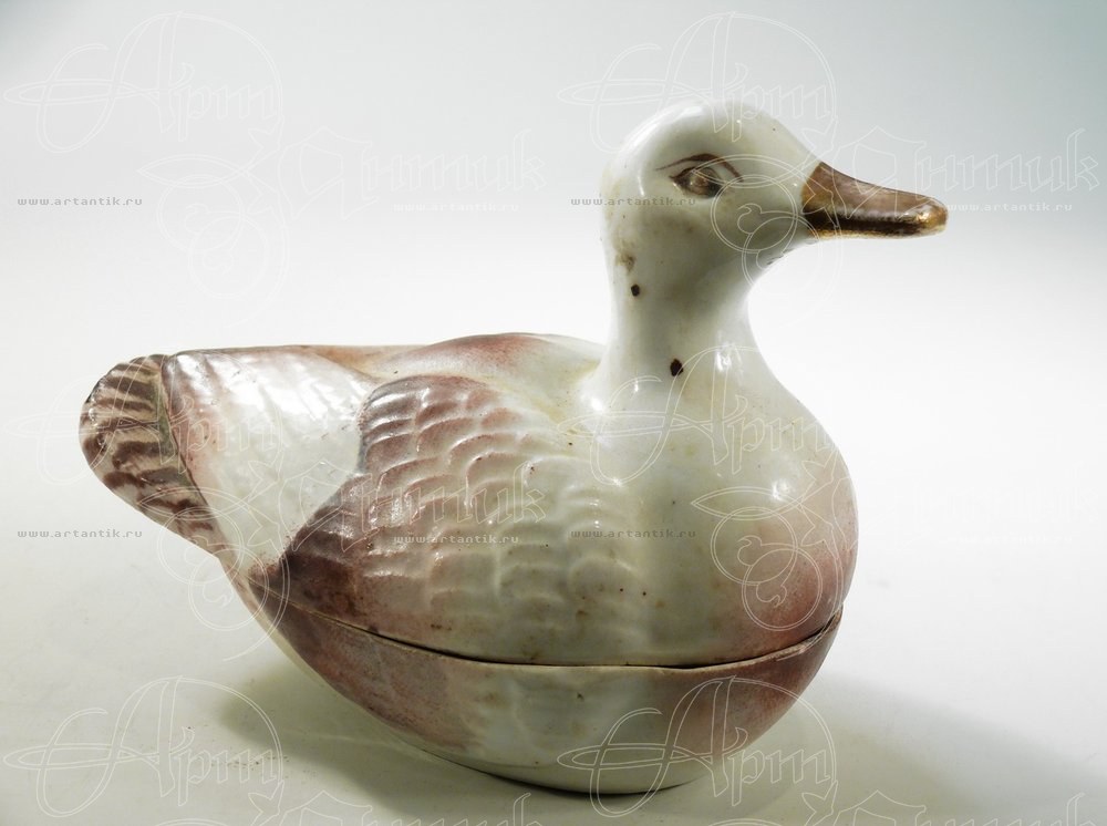 В разделах Икорница "Утка", №33193В конце XIX века в искусстве керамики возникло направление, получившее название натурализм. Оригинальные масленки, пепельницы и шкатулки в виде животных, фруктов, чаш с плодами и орехами — лишь незначительная часть того, что выпускалось в этом стиле на кузнецовских и других заводах на рубеже ХIХ - ХХ веков.