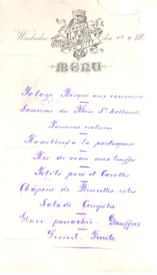 Меню обеда ресторана "Висбаден" 12... 1886 года