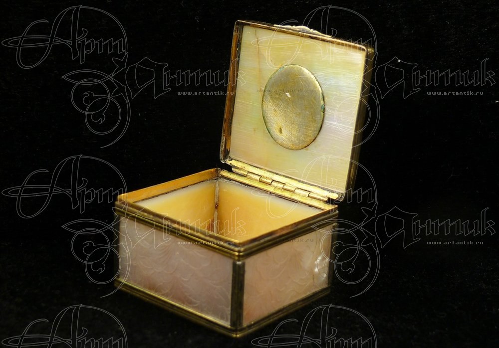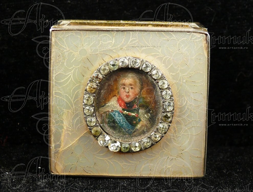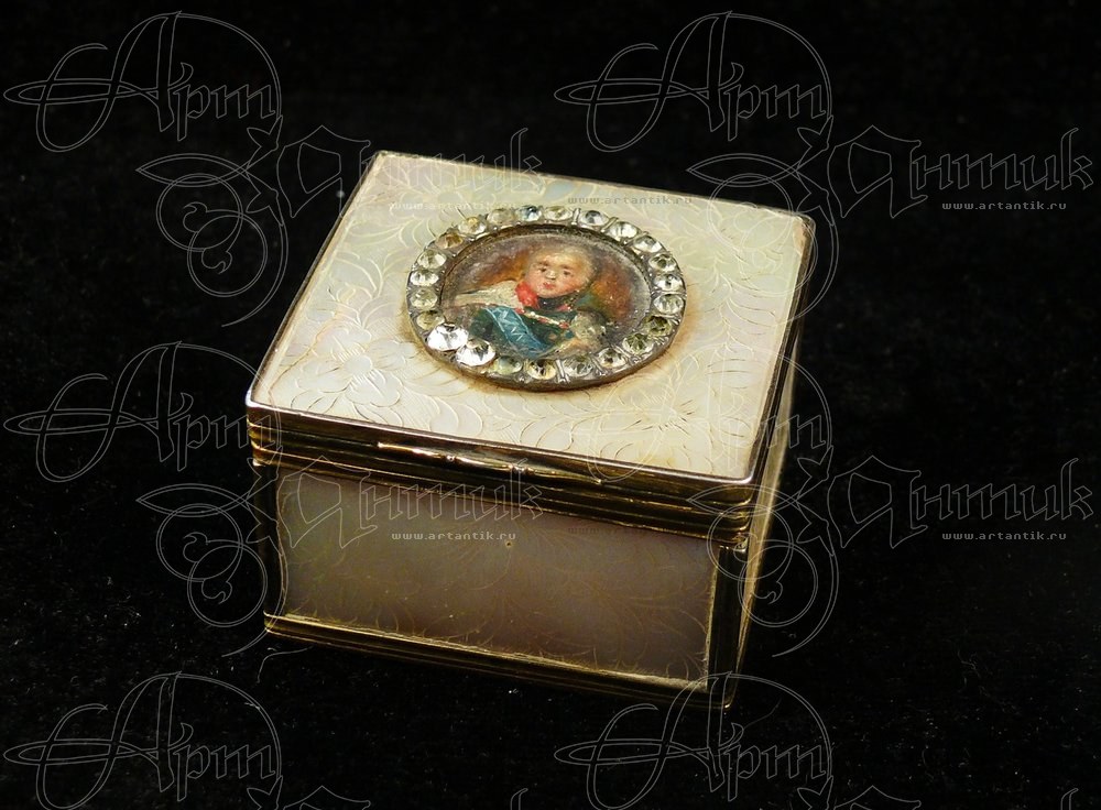 Небольшая перламутровая шкатулка, в окантовке из позолоченного серебра, на верхней крышке - серребряная вставка с живописным портретом Александра I в обрамлении сверкающих стразов.