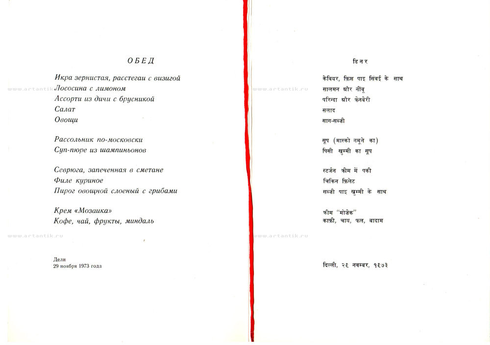Меню обеда в посольстве СССР в Дели во время визита Л.И. Брежнева в 1973 году