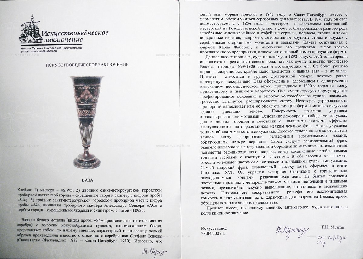 Данная ваза является своего рода редкостью, так как работ мастера этого периода сохранилось очень мало. Предмет имеет антикварное, художественное и коллекционное значение.