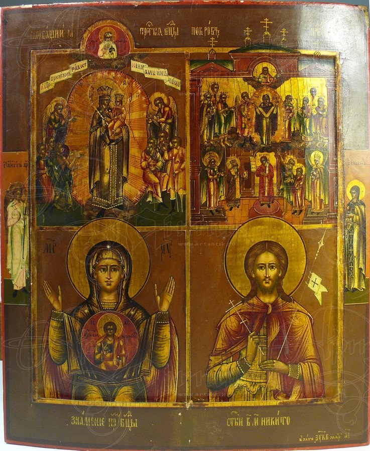 В разделах Икона четырехчастная, №41548Четырёхчастная икона: "Богоматерь Всех Скорбящих Радость", "Покров Пресвятой Богородицы", "Знамение Пр. Богородицы", "Св. вм. Никита".