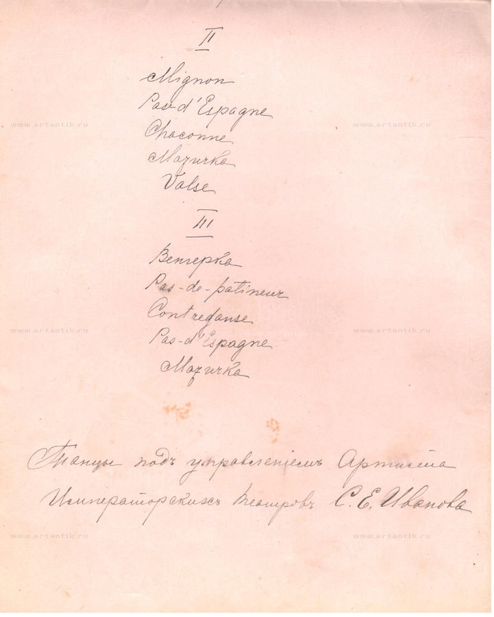 В разделах Программа концерта в пользу недостаточных учениц Екатерининских Фельдшерских курсов, №4197Танцы под управлением Артиста Императорских Театров С.Е. Иванова.