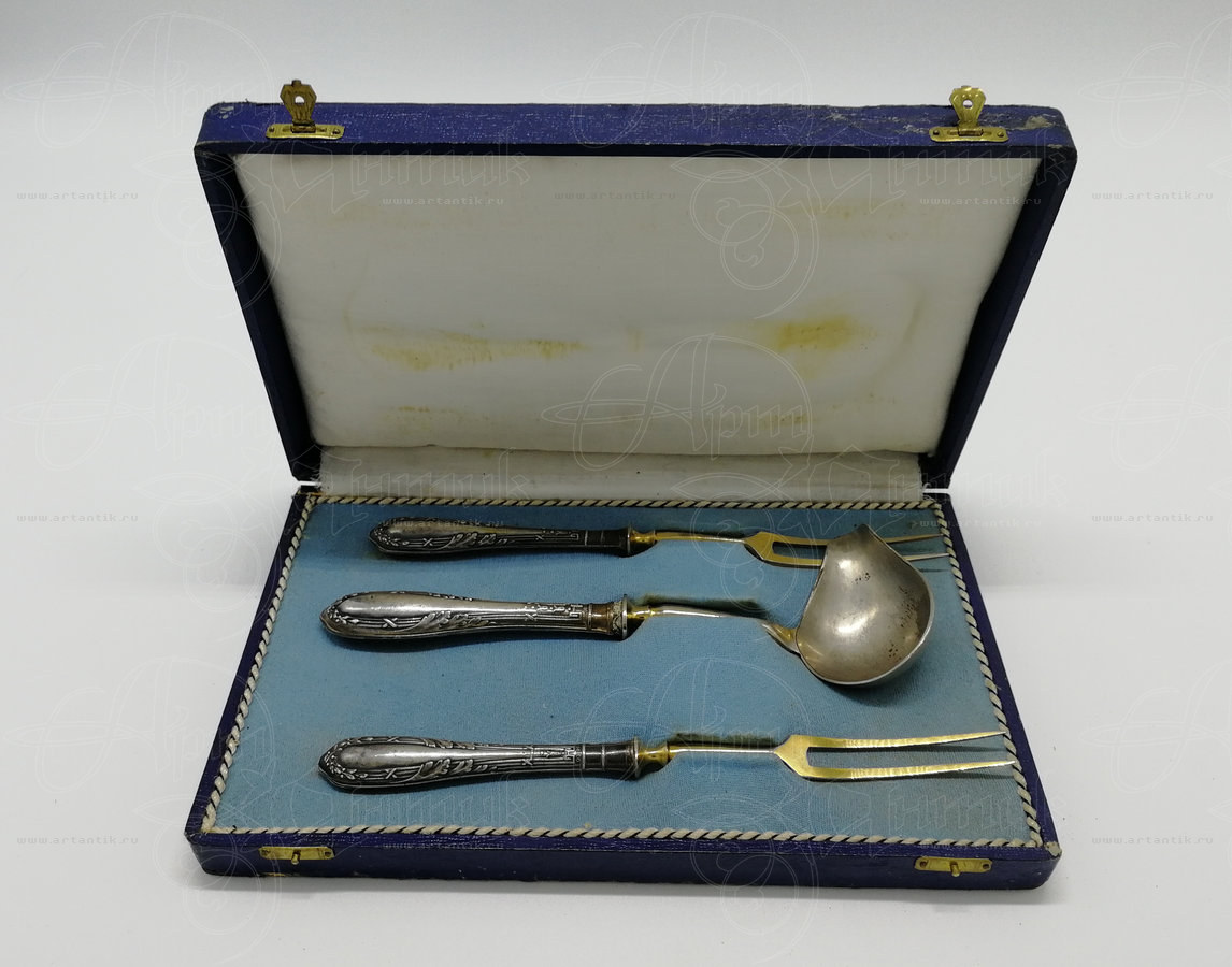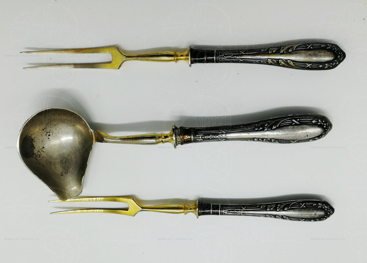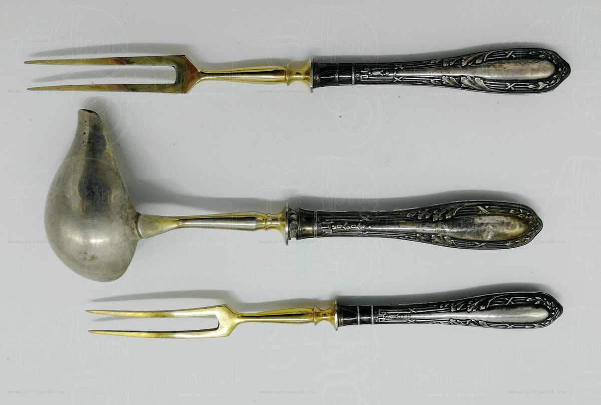 Состоит из трёх предметов, 2 вилки для рыбы и ложка для соуса