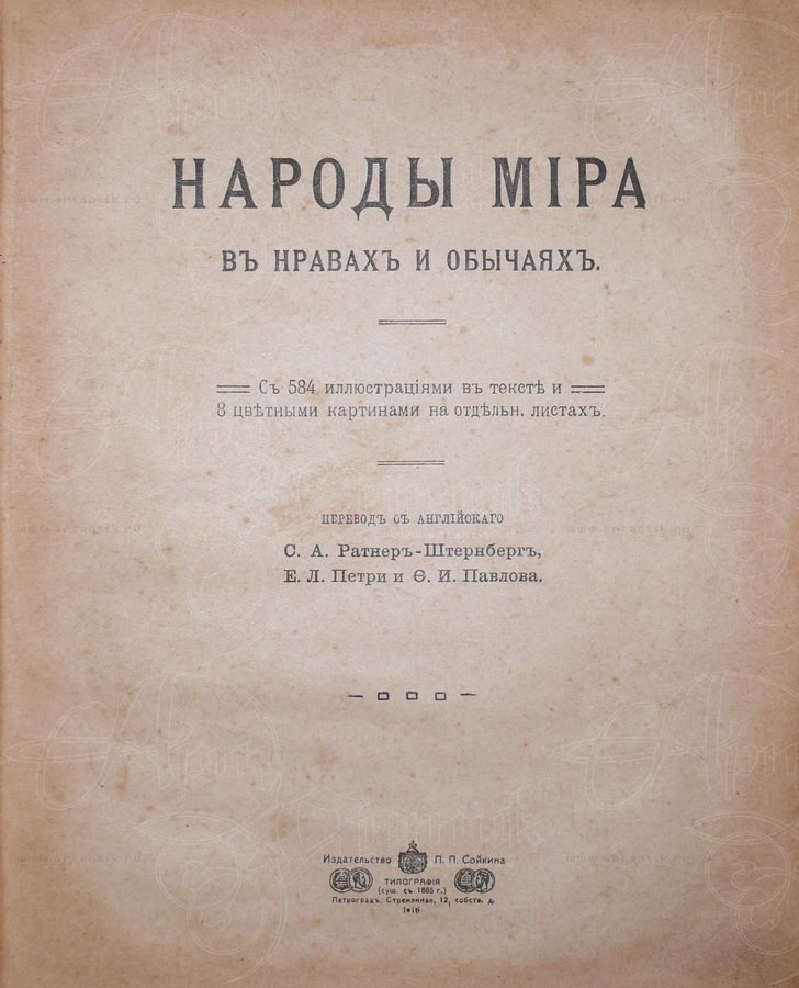 Петроград. 1916 г. Издательство П.П. Сойкина. 640 стр. с 584 иллюстрациями в тексте. В издательском переплёте. Стр. 639 и 640 утрачены.