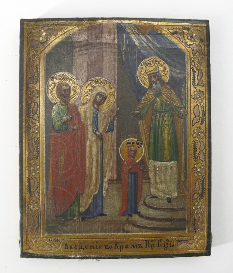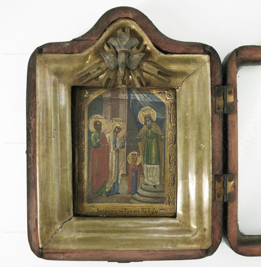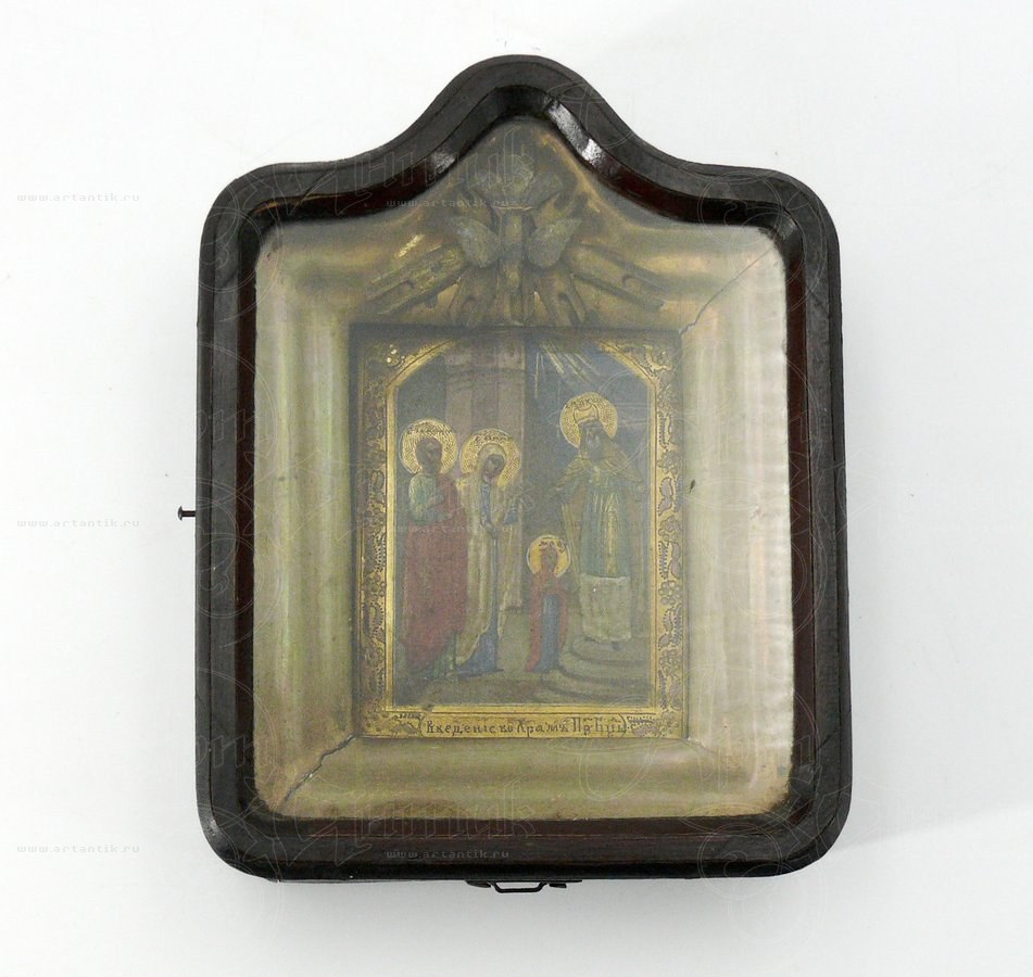 Икона "Введение во храм Пресвятой Богородицы" в киоте.Цена: Российская империя, конец XIX, начало ХХ векаВведе́ние во храм Пресвято́й Богоро́дицы — христианский праздник, основанный на том, что родители Богородицы святой Иоаким и святая Анна, исполняя обет посвятить своего ребёнка Богу, в трёхлетнем возрасте привели свою дочь Марию в Иерусалимский храм. Пречистая Дева Мария введена была в храм Господень. При этом первосвященник Захария совершил необычайное и для всех удивительное дело: он ввел отроковицу в самую выстроенную скинию, называемую "святая святых", куда нельзя было входить не только женщинам, но даже и священникам, а мог туда входить только первосвященник, однажды в год.
