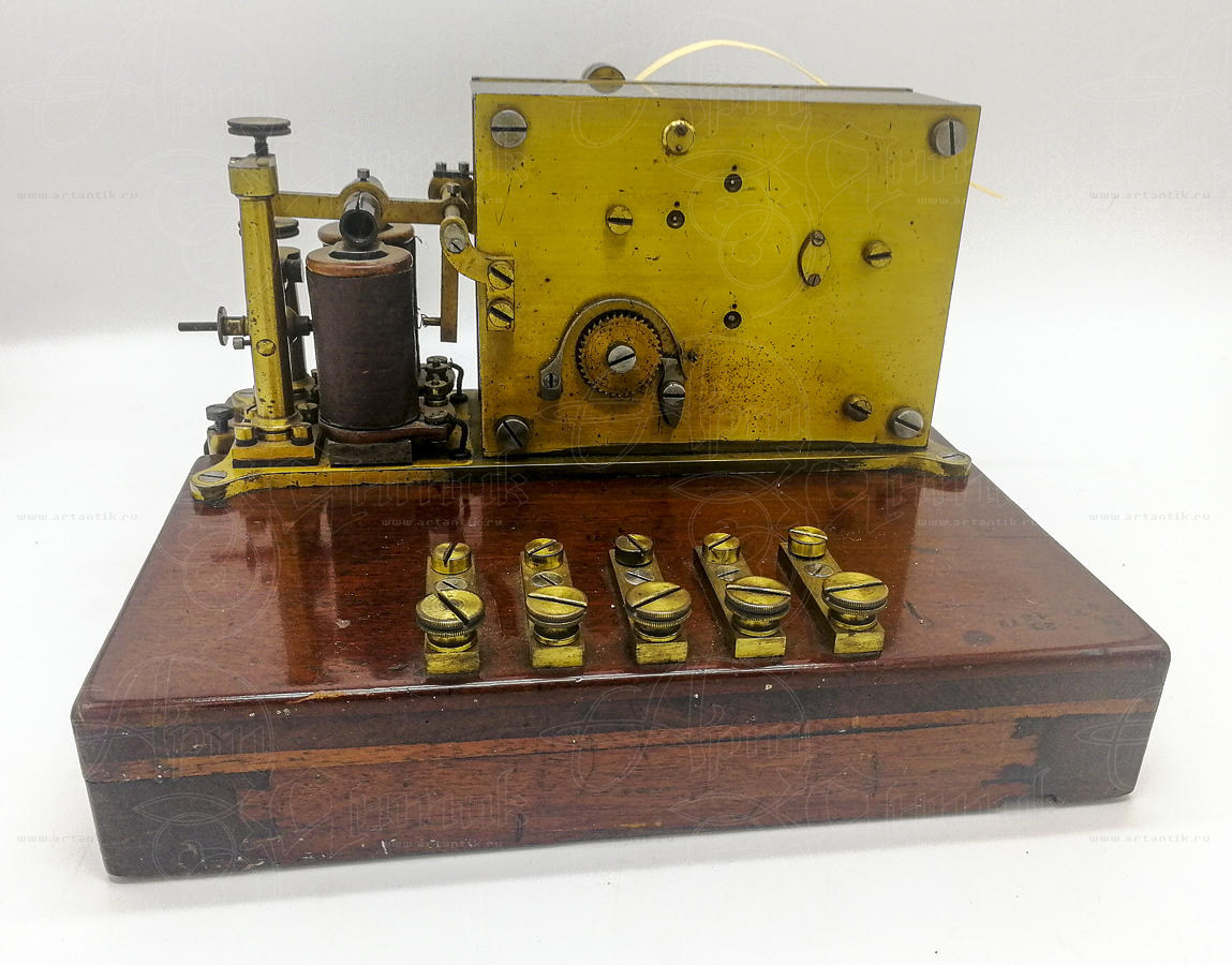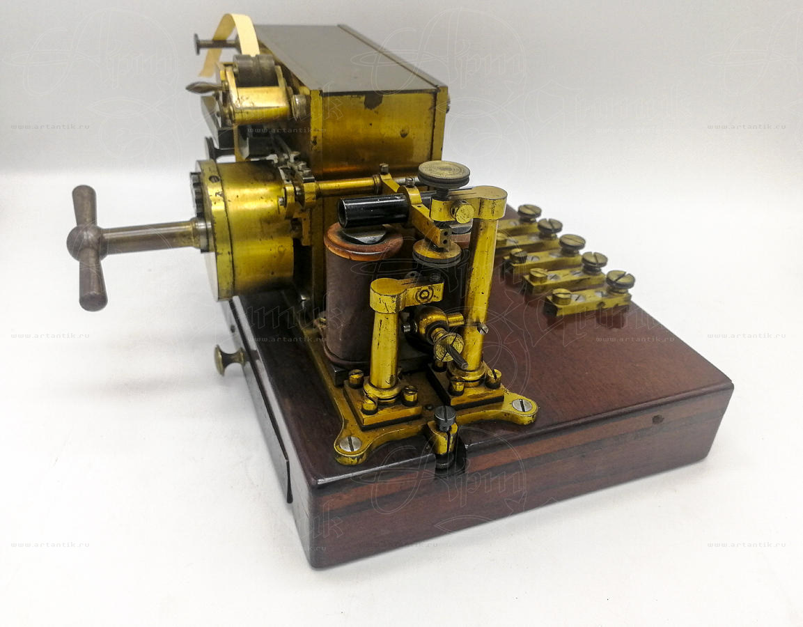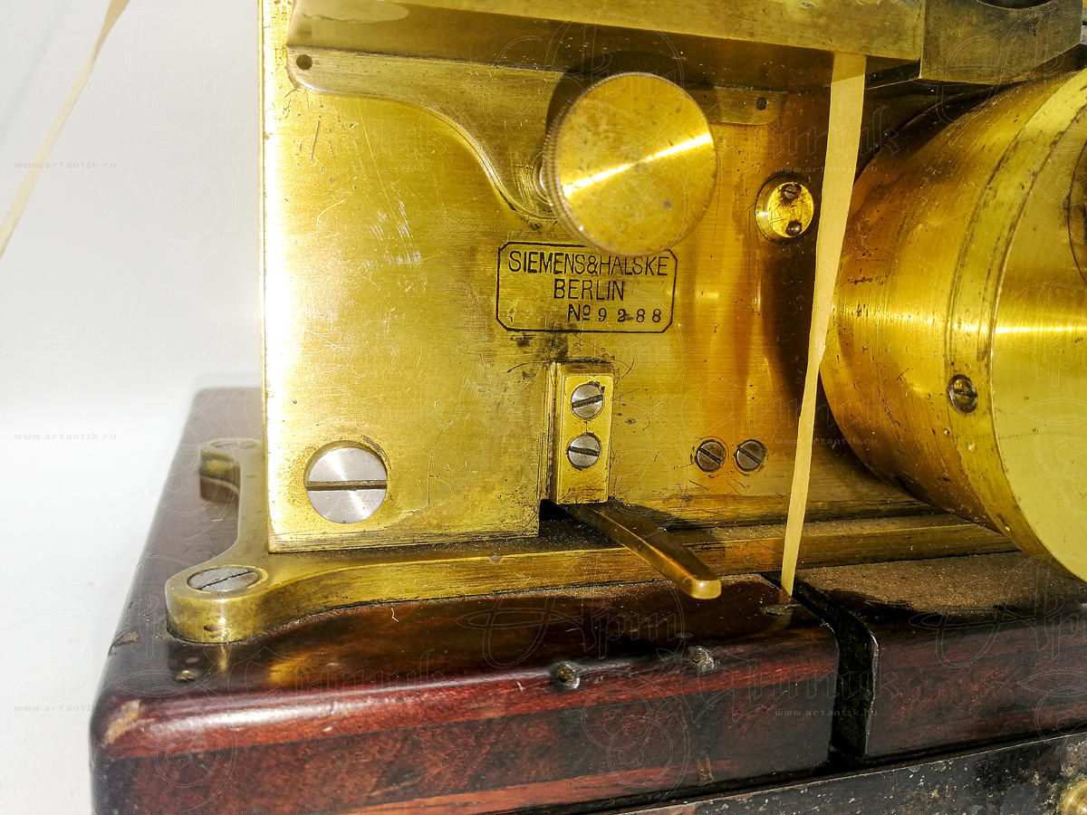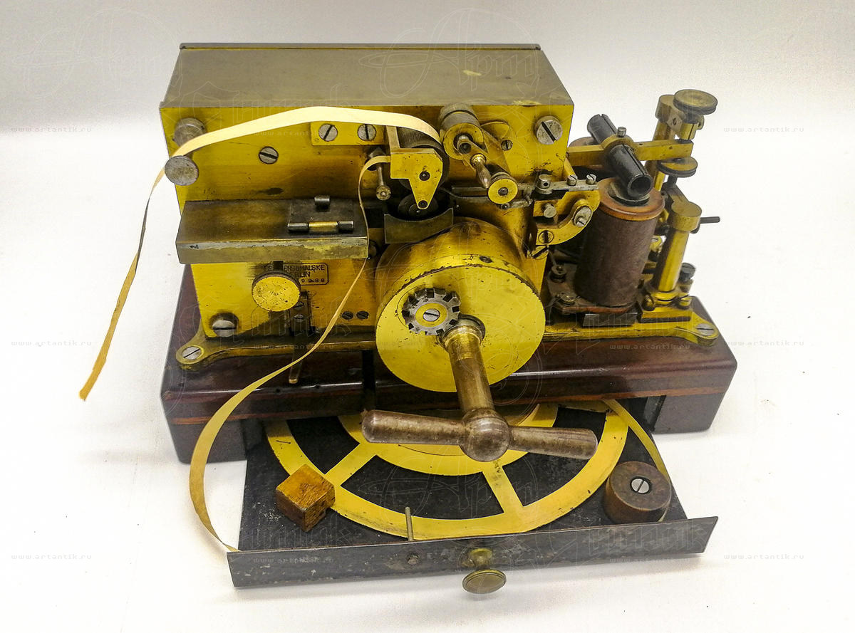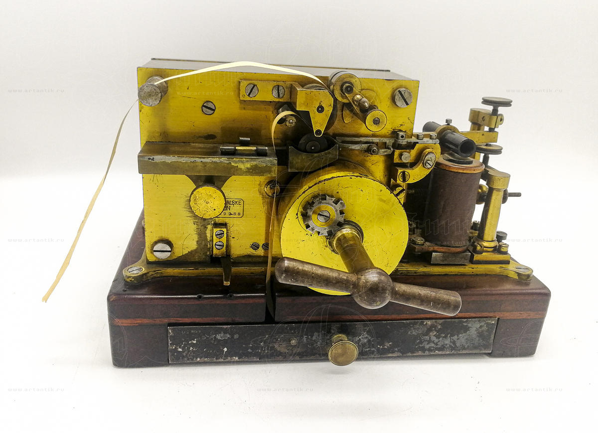 Телеграфный аппарат "Siemens & Halske"Цена: Берлин, 1867 годЭто приемное устройство - телеграф, изготовлено фирмой Siemens & Halske (Сименс унд Хальске) — немецкая компания, занимавшаяся производством электротехнического оборудования, железнодорожного транспорта и бытовой техники. Модель носила название «Normalfarbschreiber der Deutsche Verwaltung» (Стандартное печатающее устройство немецкой администрации) и стала стандартной моделью немецкого телеграфного управления с 1867 по 1870 годы. Это модель, в которой пружина двигателя установлена снаружи в цилиндрическом корпусе из латуни. Кроме того, он имеет функцию «встроенного реле», позволяющую автоматически ретранслировать принятые сигналы прямо на другой приемник, подключенный к той же линии (либо каскадом вдоль линии, либо на удаленном конце). Блок слева - это чернильница. Горизонтальная часть содержит чернила, а вертикальная часть может быть поднята, если уровень чернил упадет слишком низко. Поскольку это была стандартная модель, она была очень популярна и производилась рядом других производителей (например, Lorenz). Во второй версии пружина была встроена в блок двигателя.