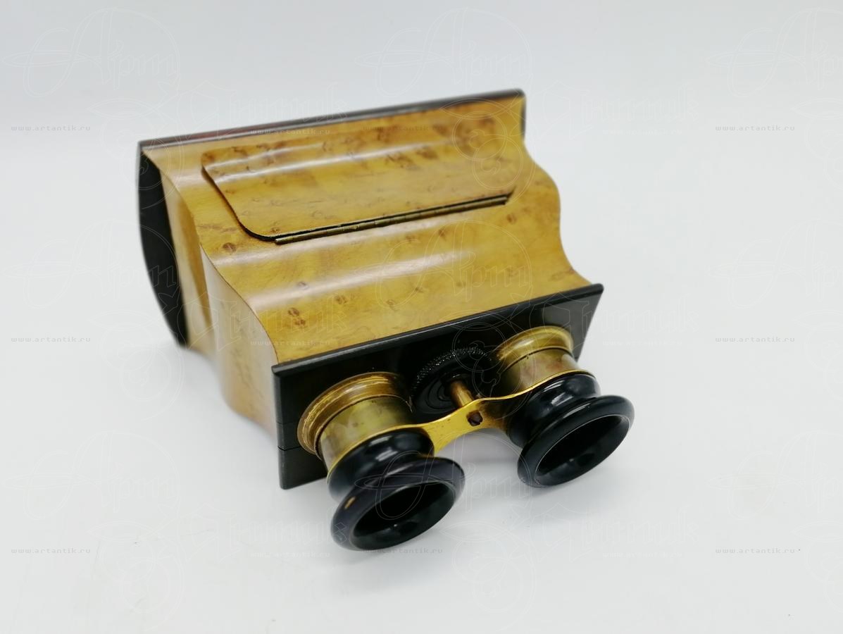 Облицован древесиной клёна "птичий глаз", отделка шелаком. Оптика чистая (без замутнений). В комплекте кейс для хранения прибора и три стереопары на стекле.