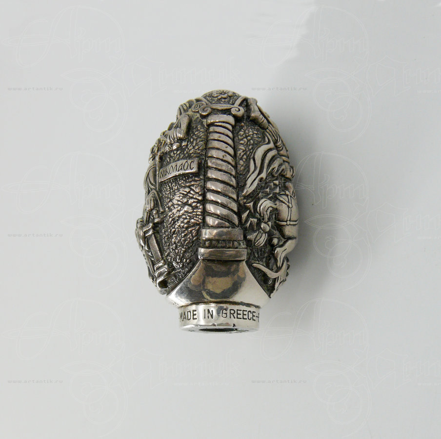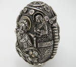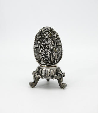 В разделах Яйцо пасхальное на подставке, №46168Пасхальное серебряное яйцо с объёмным, детально проработанными изображениями Св. Николая Чудотворца с одной стороны и Св. Георгия Победоносца, поражающего змия, - с другой.