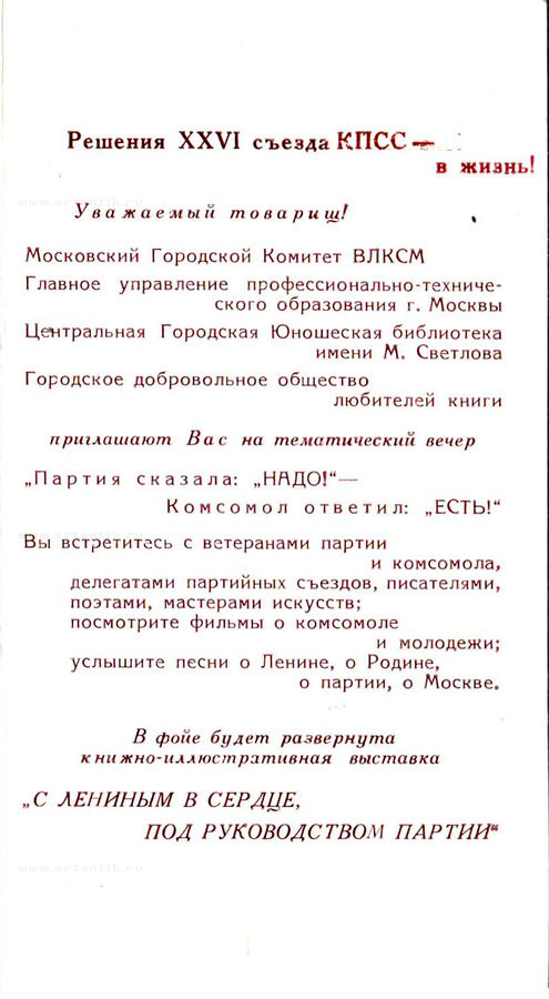 На тематический вечер "партия сказала : НАДО!" - Комсомол ответил "ЕСТЬ " 1981 г.