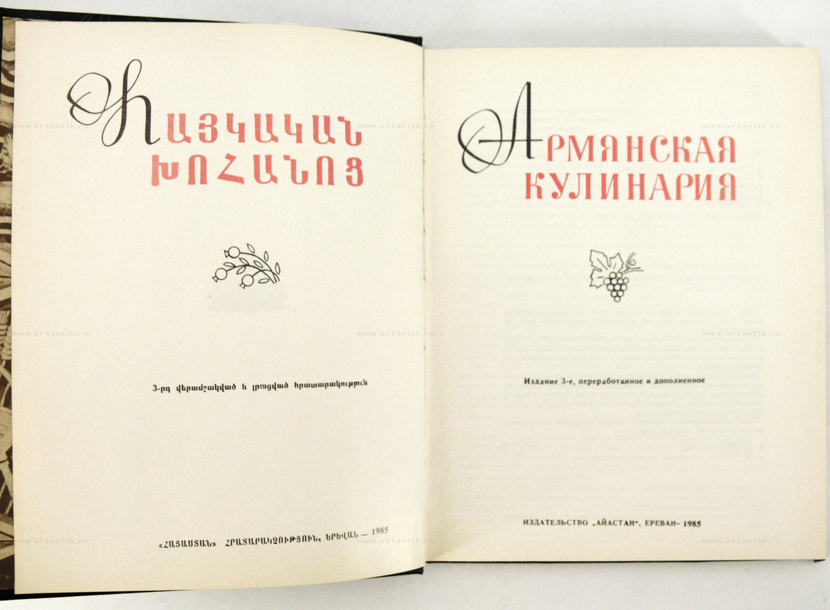 Книга "Армянская кулинария"Цена: Издательство "Айстан", Ереван, 1985г.Книга « Армянская кулинария» Знакомит читателей с армянской национальной кухней. В ней приведены рецептуры и технологии приготовления разнообразных блюд. Большой интерес представляют некоторые старинные блюда армянской кухни, которые благодаря своим высоким вкусовым качествам и питательной ценности не потеряли значение до настоящего времени и могут быть рекомендованы для включения в рацион.