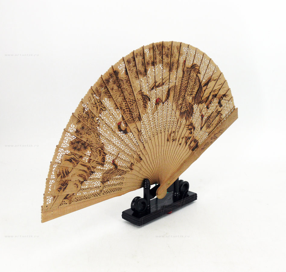 Веер на подставке в подарочной коробкеЦена: Китай. Вторая половина ХХ века.Складной веер, пластинки которого украшены ажурной деревянной резьбой с изображением аистов.