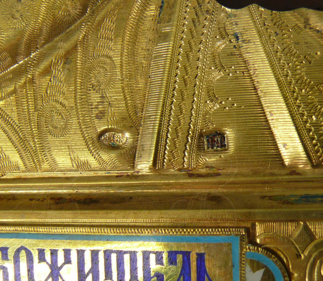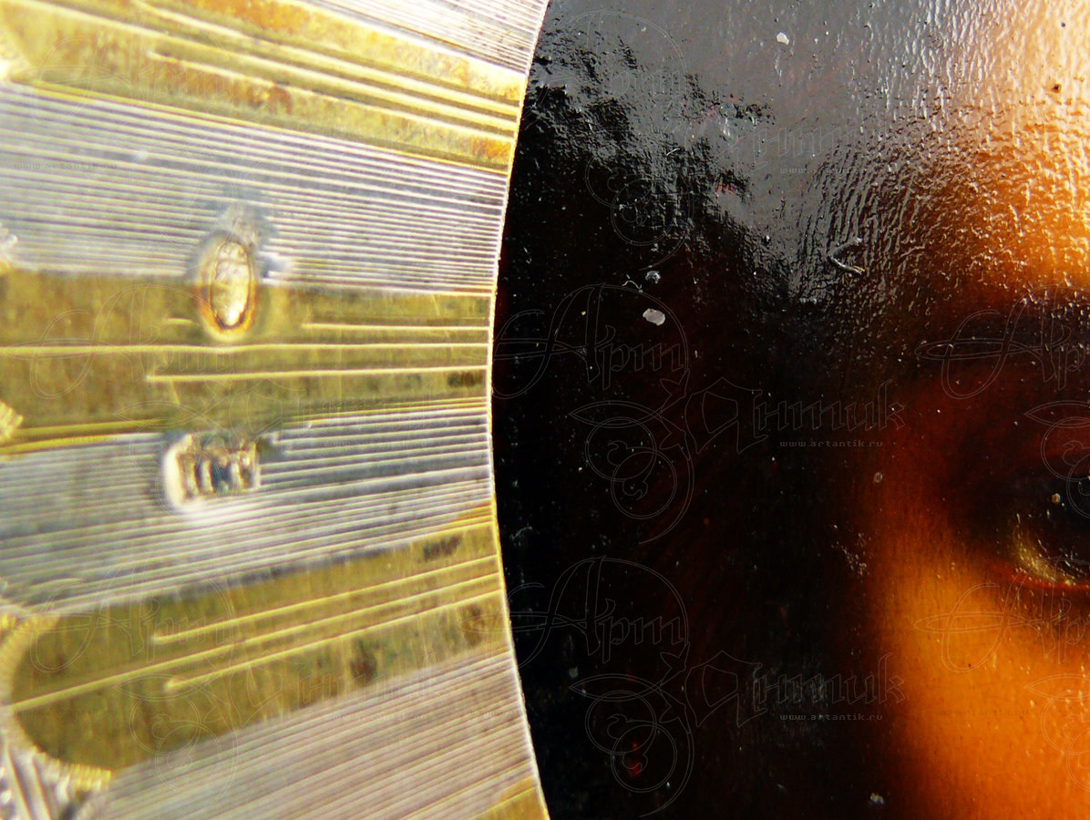 Подокладная икона, в серебряном окладе с позолотой. Клейма : мастера "П.Т", серебро 84*, женская голова в кокошнике обращенная влево, с буквами Я Л. (Петербургского пробирного управления с инициалами пробирного мастера Якова Ляпунова 1899 -1903 г.)
