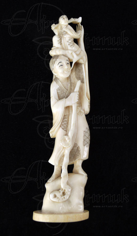 Окимоно "Странник с посохом"Цена: Япония. Начало XX векаОкимоно - миниатюрная японская скульптура, похожая на нэцкэ и по оформлению, и по сюжетам, и, нередко, по размерам. В окимоно всегда отсутствует отверстие для шнура, так как эти фигурки лишены утилитарных функций. В традиционном европейском понимании окимоно — это статуэтка.